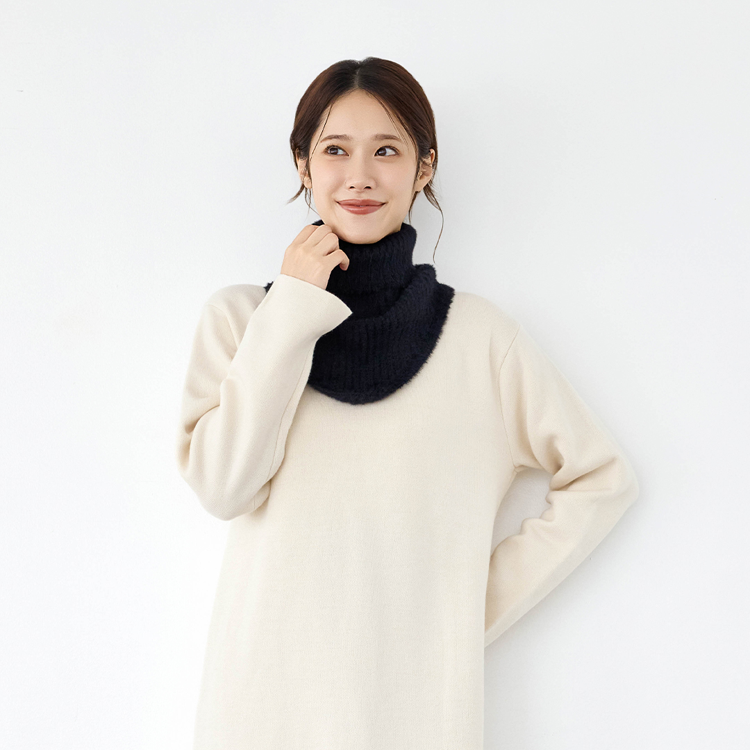 マフラーのように巻く手間がなく、タートル風のデザインで