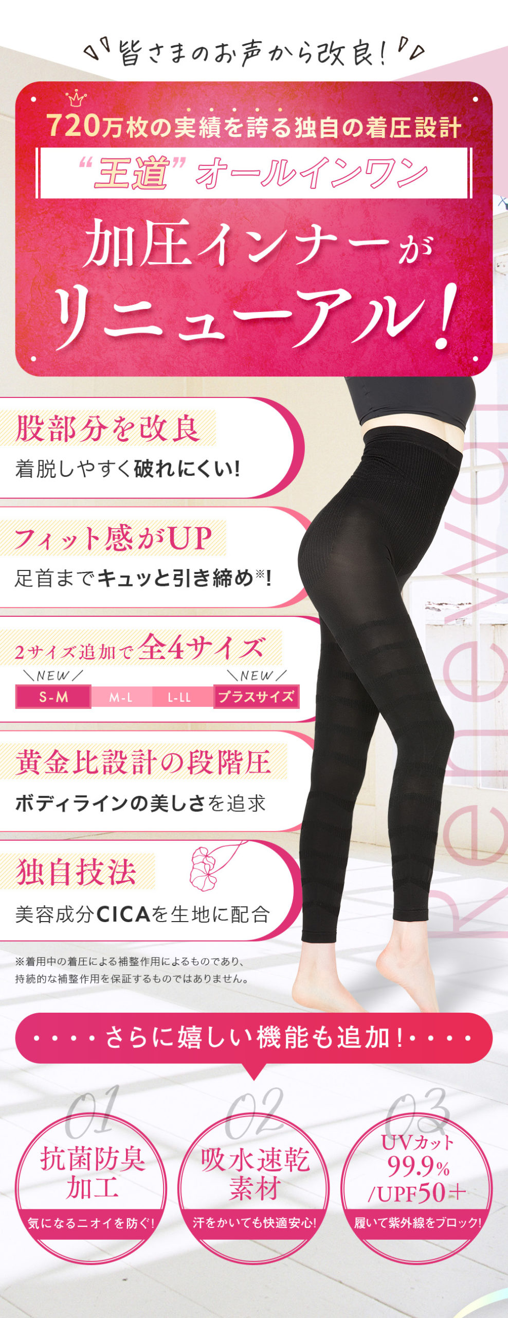 2023年5月のリニューアルでは、股部分の強度を高めて破れにくさと着脱のしやすさを向上。足首までしっかりフィットする着圧感に加え、全4サイズ展開へと進化しました。