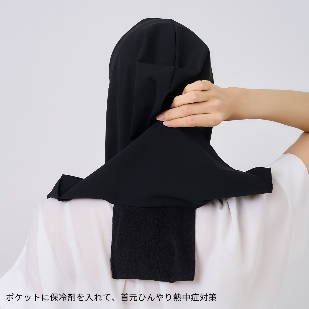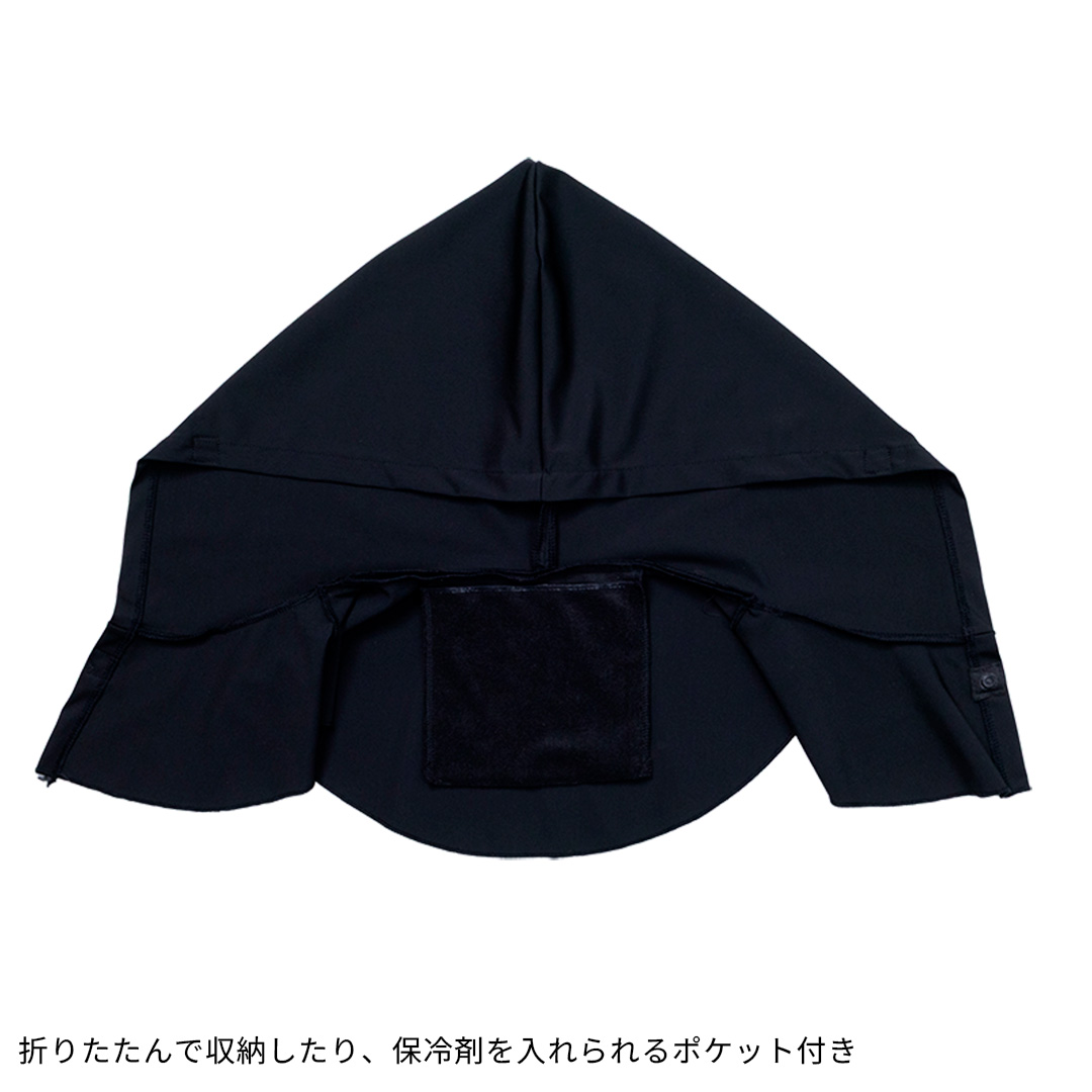 ひんやりとした触感の生地を採用し、ポケット部に保冷剤を入れて使える設計。スナップボタンやストッパーでフィット感を調整しやすく、着脱もスムーズです。