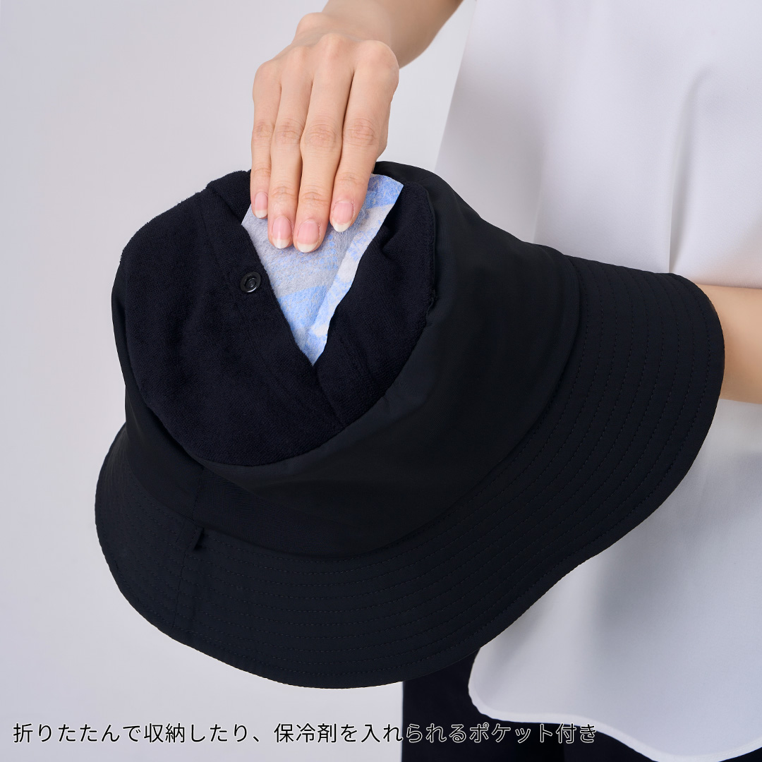 ひんやりとした触感の生地を採用し、ポケット部に保冷剤を入れて使える設計。ストッパーでフィット感を調整しやすく、持ち運びにも便利なコンパクト仕様です。